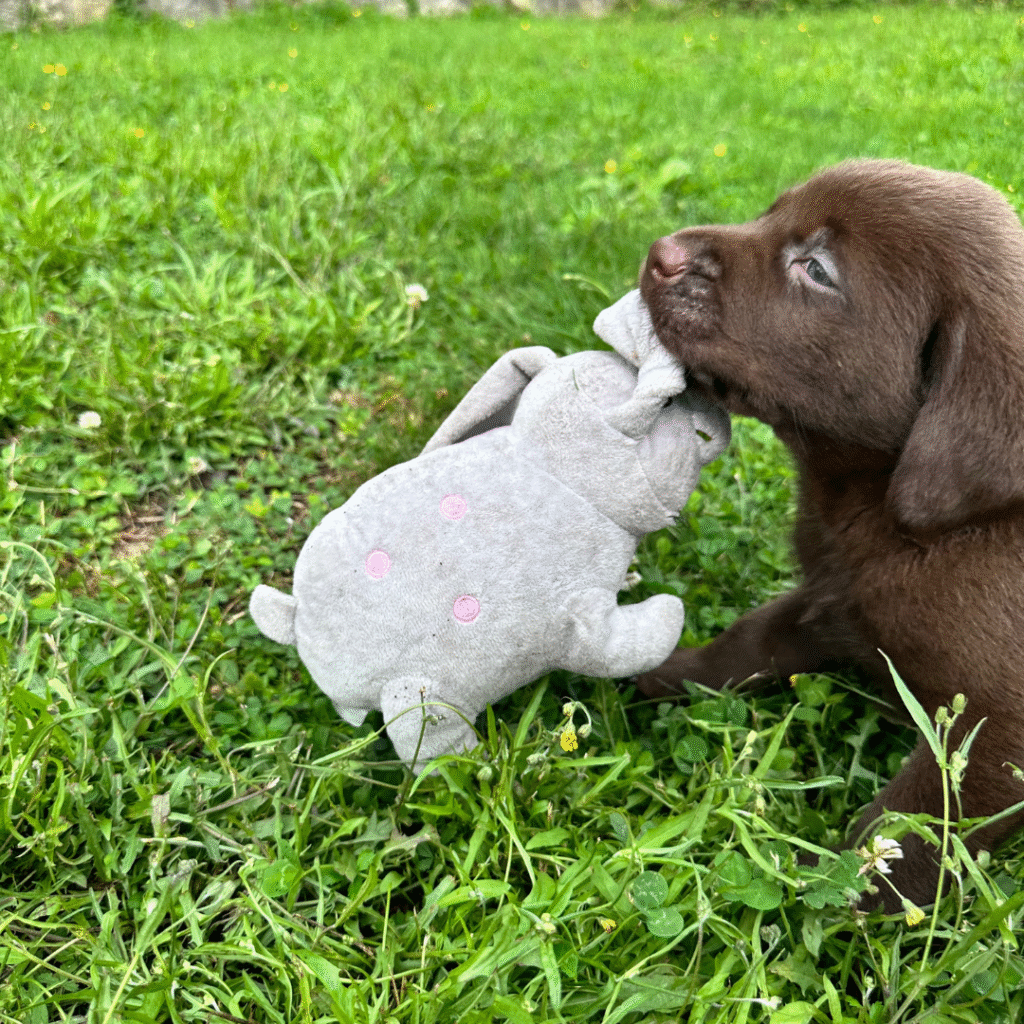 In dieser Phase werden die Retriever Welpen auf die unterschiedlichsten Reize ihrer Umgebung sowie Artgenossen und Menschen geprägt. Wir setzen den Welpen bewußt einer Geräuschkulisse aus. Es wird mit vielen unterschiedlichen Spielzeugen gespielt. Wir verbringen viele viele Stunden mit diesem Welpenspiel.