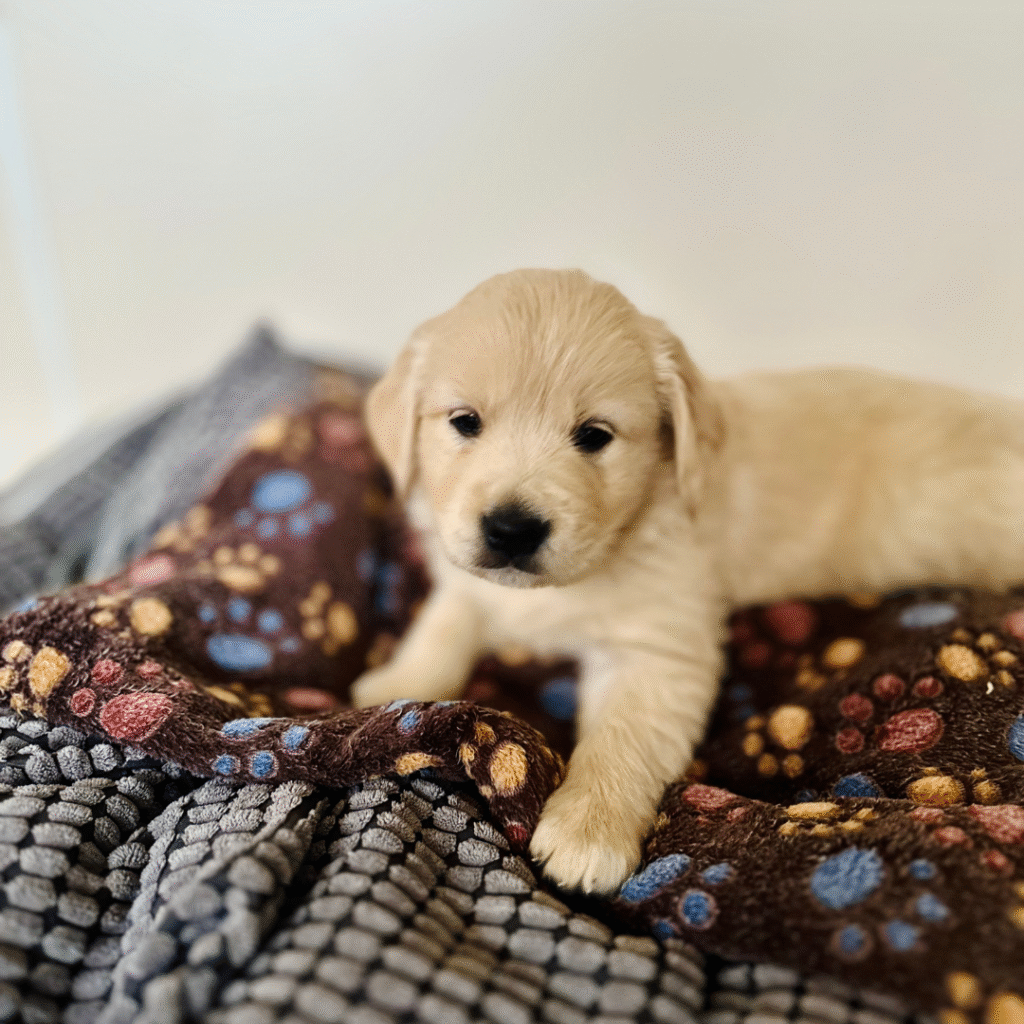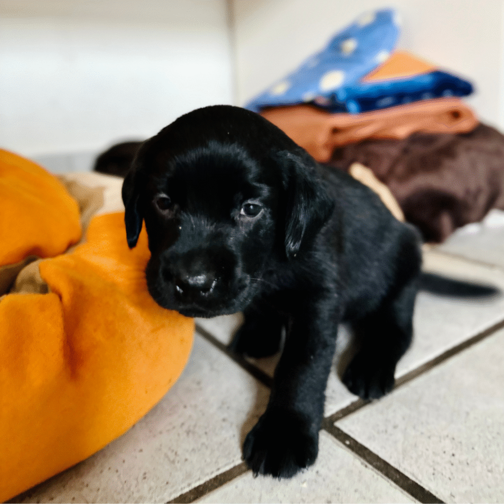 Etwa zwei Wochen vor dem geplanten Termin zieht die Mutterhündin in das helle, gekachelte Retriever Welpenzimmer mit “Pfotenbodenheizung” um. Die erste Woche nach der Geburt ist in der Retriever Welpenaufzucht für alle sehr anstrengend. Trotzdem lässt die Mutter ihre Kleinen keinen Moment aus den Augen, während wir sie wiegen oder bei den ersten Schritten auch mal über eine Schwelle heben.